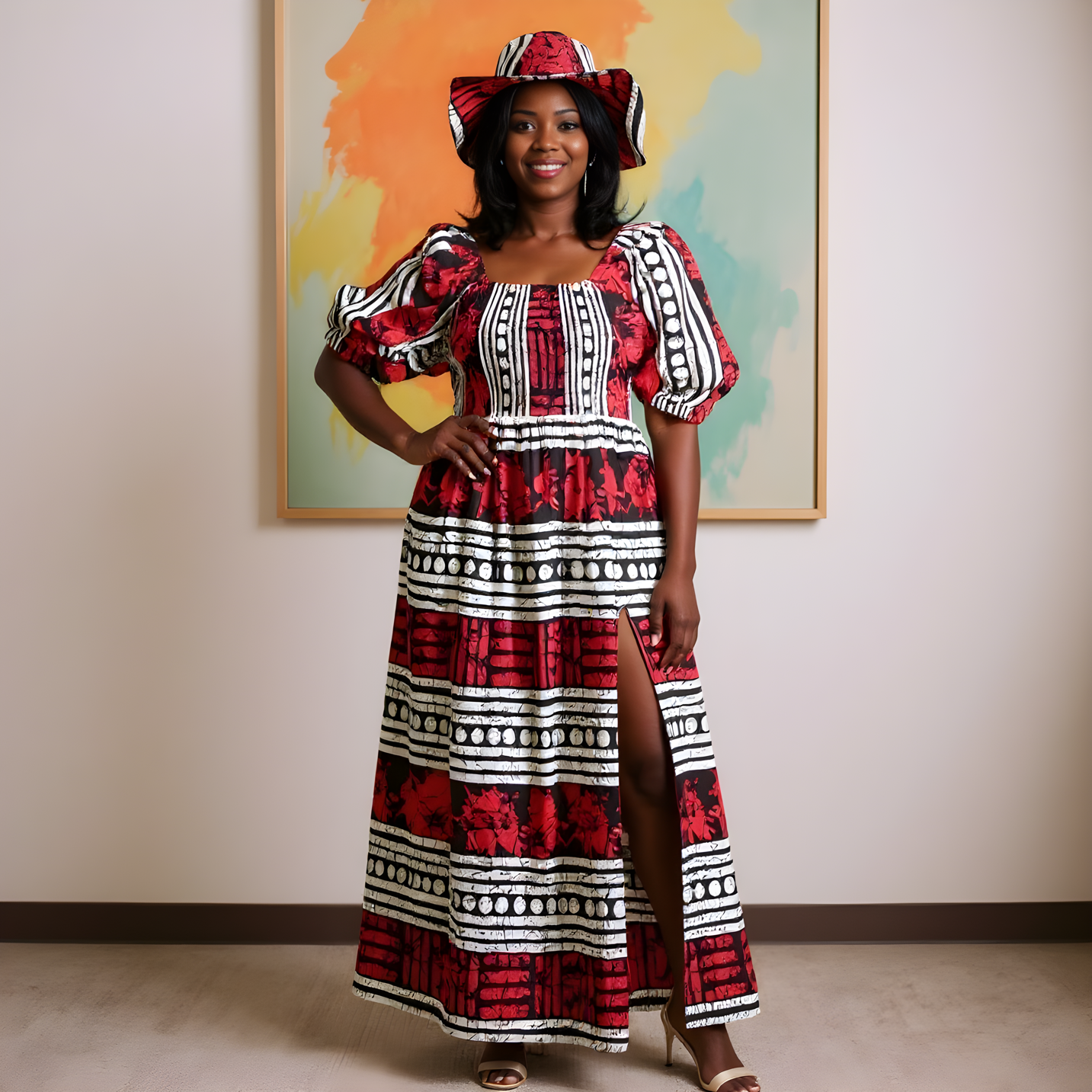 This outfit features a striking dress and matching hat, both adorned with a bold black, white, and red pattern. The dress features a full, flowing silhouette with a thigh-high slit on one side, adding a touch of elegance while maintaining comfort and ease of movement. The fabric features large floral prints in red, interspersed with geometric patterns in black and white, creating a dynamic and eye-catching design.