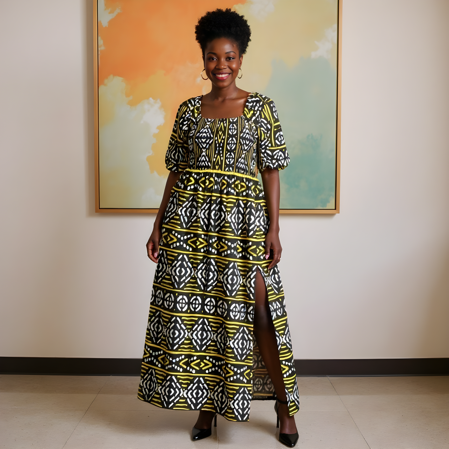 The outfit in the image consists of a beautiful dress and a matching hat, both made from a vibrant, patterned fabric. The dress is a long, flowing garment with a flattering A-line shape. It features a combination of warm, earthy tones like brown and orange, decorated with geometric patterns in white and black. The dress has short, puffed sleeves, and the neckline is gathered, giving it a relaxed, yet stylish look. A thigh-high slit on the side adds a hint of sophistication and allows for ease of movement.