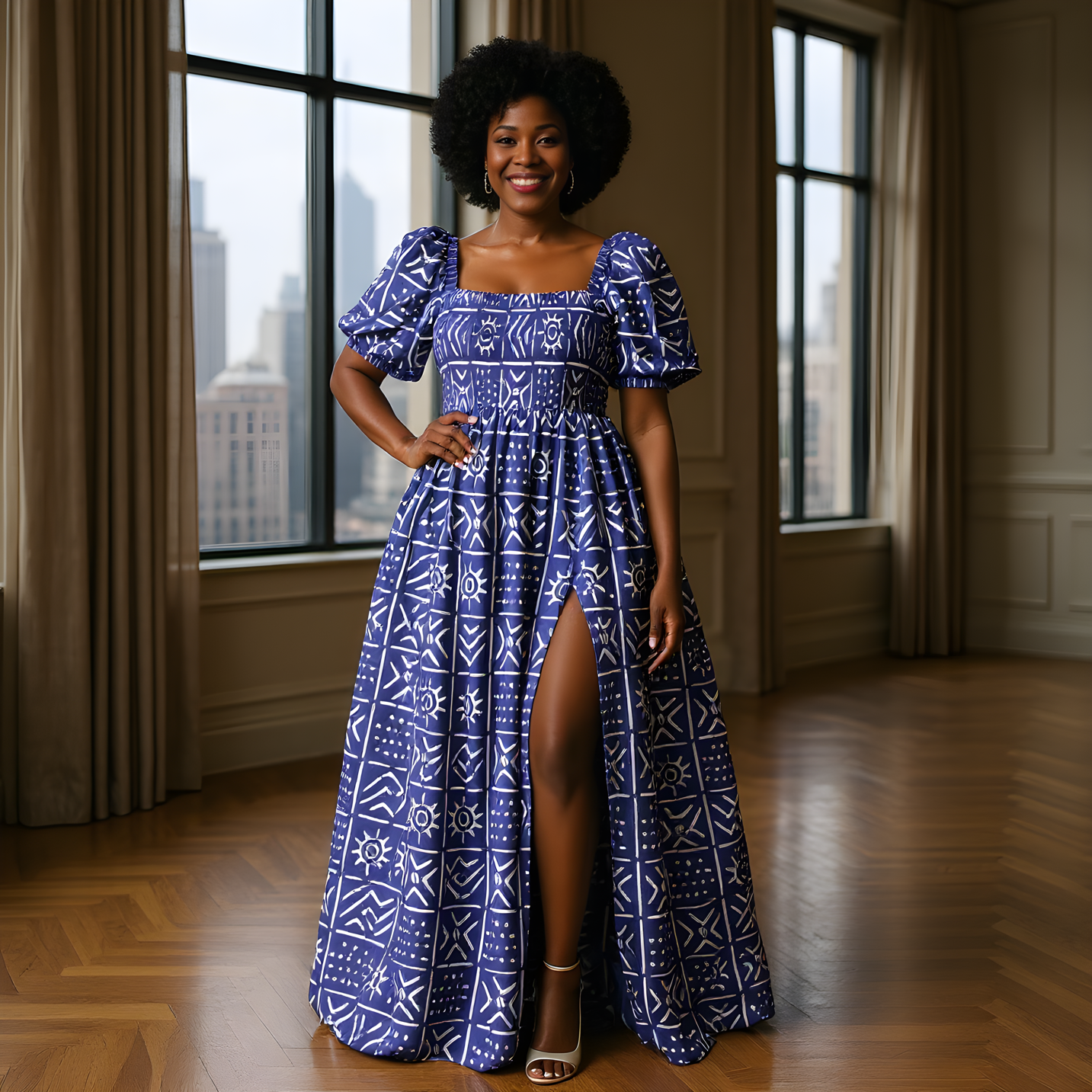This outfit features a beautiful blue dress and a matching headwrap, both designed with a striking white geometric print. The dress features a long, flowing A-line silhouette with a thigh-high slit on one side, combining elegance with ease of movement. The print features star-like symbols and intricate shapes, creating a visually dynamic design that stands out against the deep blue background.