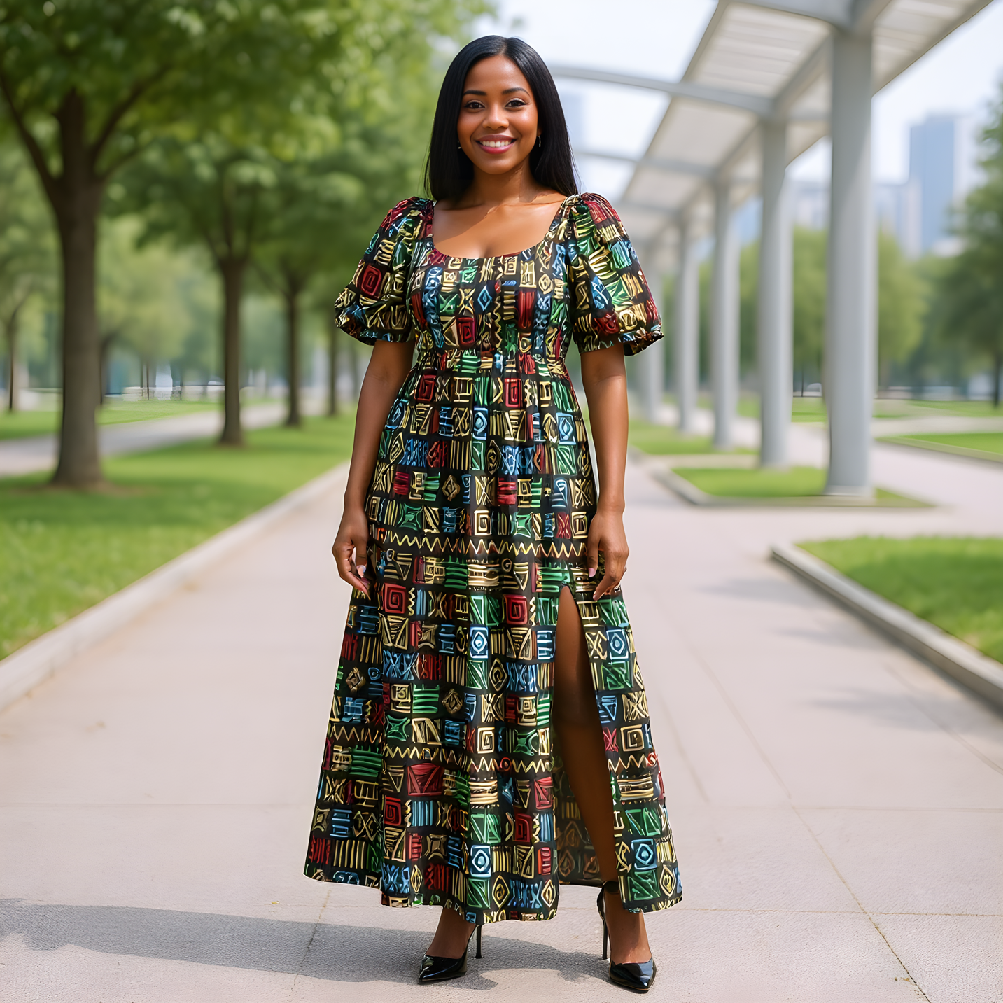 This outfit features a beautiful dress and a matching hat, both designed with an intricate, colorful pattern. The dress has a long, flowing silhouette with a thigh-high slit on one side. The fabric is adorned with bold, geometric shapes in a mix of bright colors, such as red, yellow, blue, green, and black. The design is abstract, with a playful and artistic vibe, resulting in a lively and dynamic look.