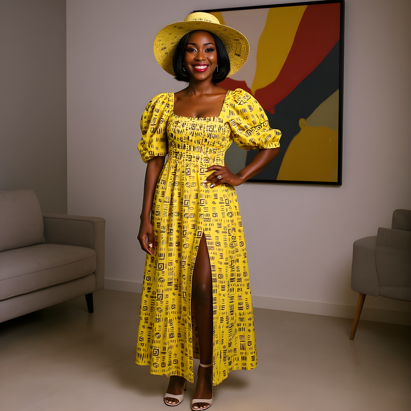 This outfit features a stunning yellow dress paired with a matching hat, both showcasing a vibrant, geometric print. The dress has a flattering, flowing A-line silhouette, with a thigh-high slit on one side that adds a touch of elegance and ease. The bold yellow fabric is adorned with black and red abstract shapes and symbols, creating a striking contrast and adding a fun, lively feel to the look.