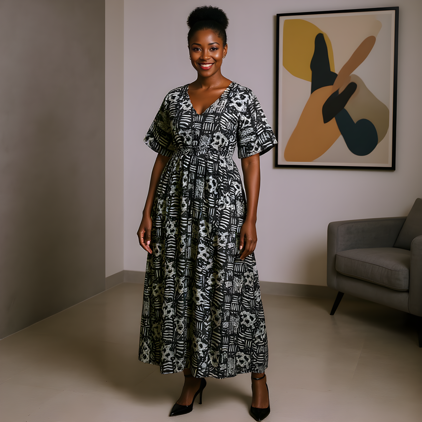 This is a flowing African print maxi dress in black and light blue with bold geometric and abstract patterns. It features a V-neckline and wide short sleeves for a comfortable, relaxed fit. The waist is cinched with elastic to create a flattering silhouette while allowing ease of movement. The ankle-length skirt drapes elegantly, and the look is completed with a matching headwrap, adding a coordinated touch. Perfect for cultural events, casual wear, or special gatherings. Fits M-3XL