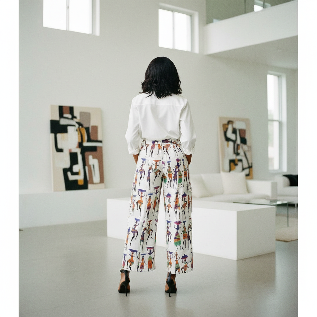 Celebrate culture and style with these African Village Print Cargo Pants, featuring a lively pattern of women in traditional attire carrying baskets in vivid, multicolored designs. These wide-leg pants are both fashionable and comfortable, bringing African heritage to modern-day wear.