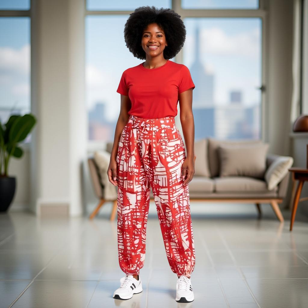 These bold jogger pants feature a striking red and white abstract pattern with a graffiti-like design that adds a modern, edgy vibe. Crafted from lightweight fabric, they offer a relaxed fit with a slightly tapered leg and elastic cuffs at the ankles for comfort and style. Perfect for casual wear or statement streetwear looks, these pants combine artistic flair with everyday versatility.