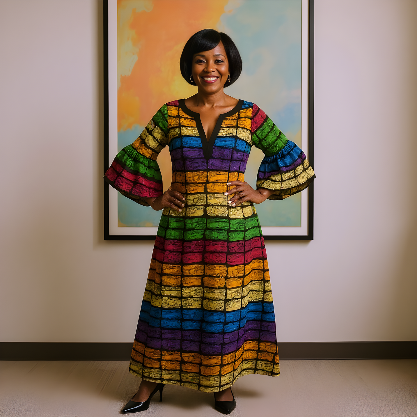 This is a vibrant, ankle-length African print dress featuring bold horizontal stripes in a rainbow of colors—green, red, yellow, blue, purple, and orange—accented with black, grid-like detailing. It has a deep notched V-neckline outlined in black for contrast and a flattering shape. The sleeves are long with layered ruffle cuffs, adding a dramatic and stylish touch. Flowing with a straight yet elegant silhouette, this dress makes a striking statement, perfect for cultural events, festive occasions, or bold everyday wear.