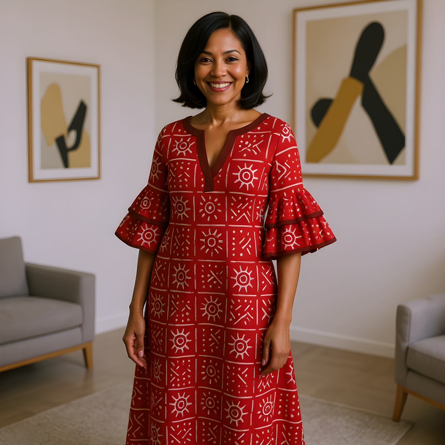 This is a striking, ankle-length African print dress in deep red, featuring bold white geometric and sunburst motifs arranged in a grid pattern. It features a notched V-neckline with a solid red panel that adds contrast and structure. The standout detail is the layered ruffle sleeves, which create volume and elegance. With its straight, flowing silhouette and vibrant design, this dress is perfect for cultural events, festive gatherings, or stylish statement wear.