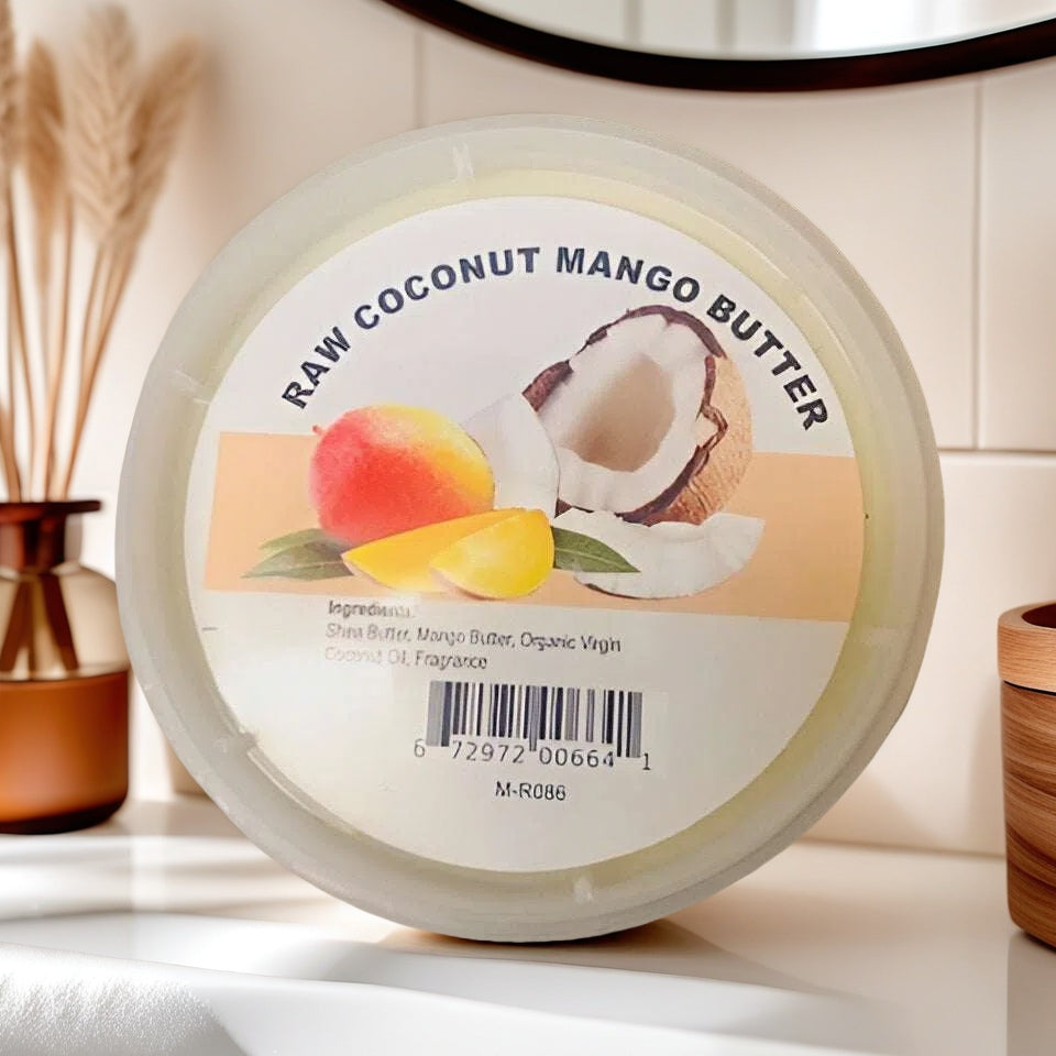 Pamper your skin with the lushness of Raw Coconut Mango Butter. It's rich, creamy formula is a heavenly infusion of nature's finest moisturizers for your skin. Coconut oil's rich moisture works wonders on dry skin, locking in hydration for that plush, velvety feel. The rejuvenating properties of mango butter help skin feel refreshed and vibrant, promoting a youthful elasticity. Meanwhile, shea butter offers a comforting embrace to soothe and repair irritated skin, making this trio a comprehensive care package for your skin’s needs.