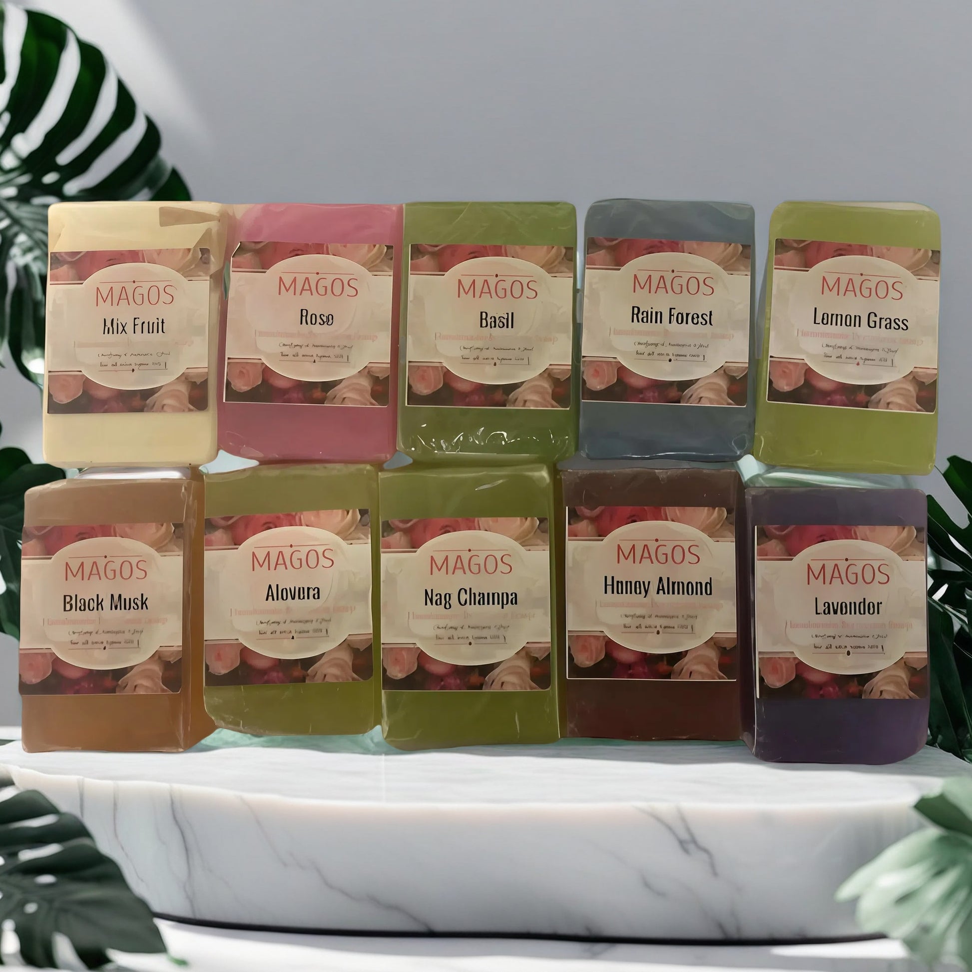 These are from the brand "MAGOS," featuring a variety of fragrances such as Mix Fruit, Rose, Basil, Rain Forest, Lemon Grass, Black Musk, Aloe vera, Nag Champa, Honey Almond, and Lavender. These soaps are handcrafted, offering a blend of unique scents that focus on high-quality ingredients and luxurious experiences.