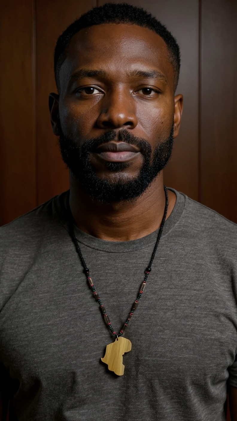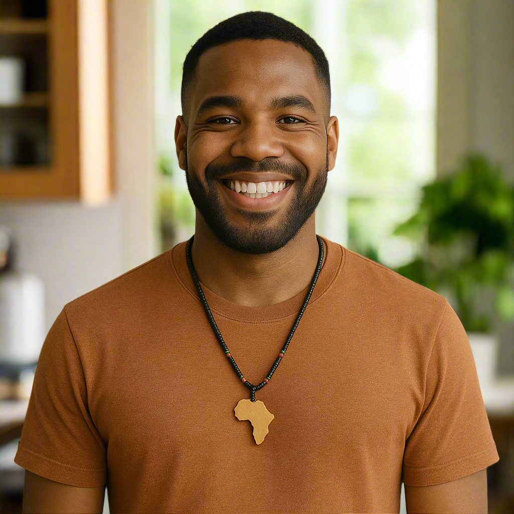 This handcrafted necklace features a wooden Africa-shaped pendant suspended from a strand of black, red, green, and brown beads. The beadwork is inspired by Pan-African colors, symbolizing unity and heritage. Perfect for cultural expression or everyday wear, this piece combines natural materials with powerful meaning.
