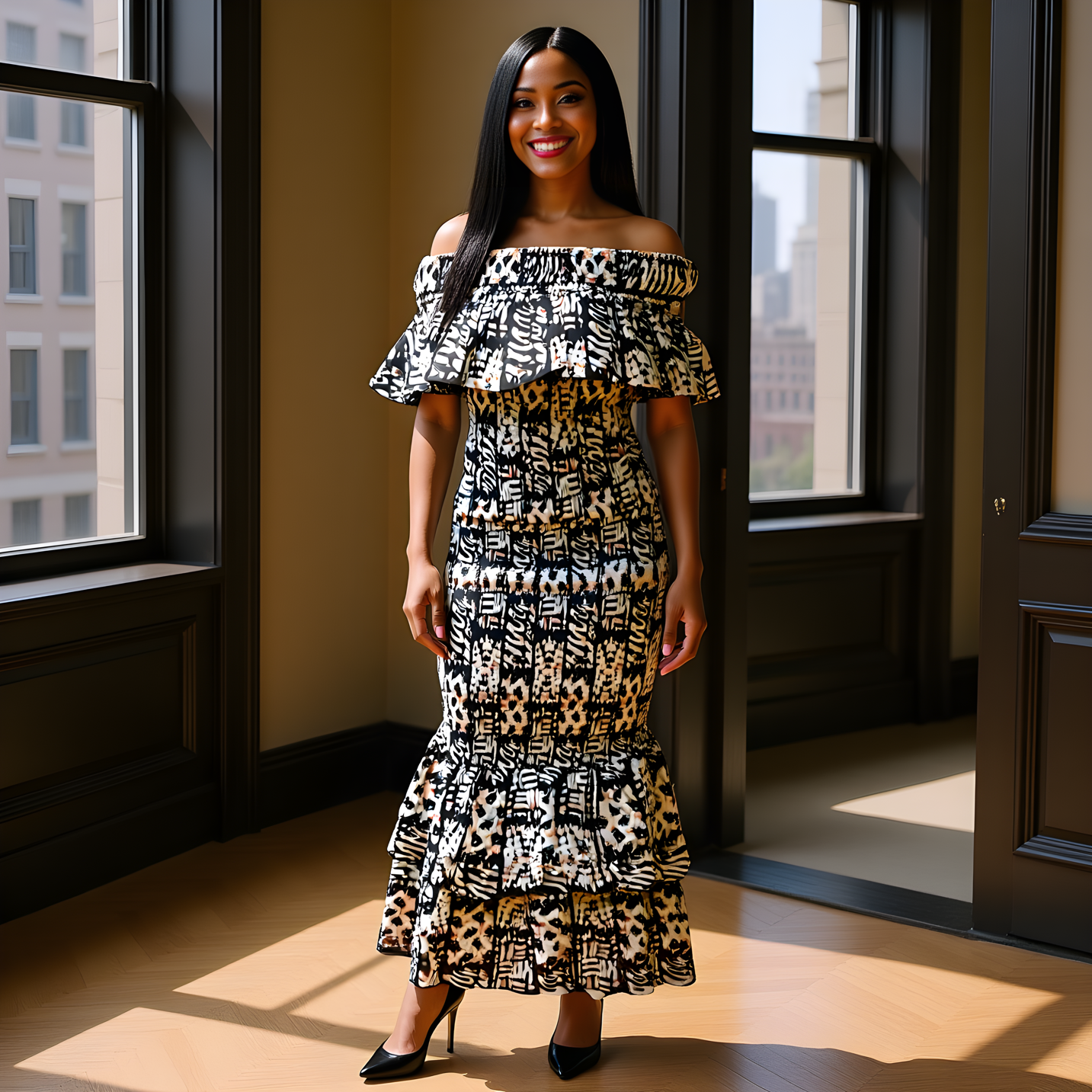This is a stylish 2-piece African print set consisting of an off-shoulder top and a matching long skirt. The off-shoulder top features an elastic neckline with a wide ruffle overlay that adds volume and elegance. The matching skirt is form-fitting through the hips with a flared hemline, creating a mermaid-style silhouette. Designed in a striking black and white patterned fabric with tribal-inspired motifs, this set is perfect for cultural events, special occasions, or making a bold fashion statement. Free size