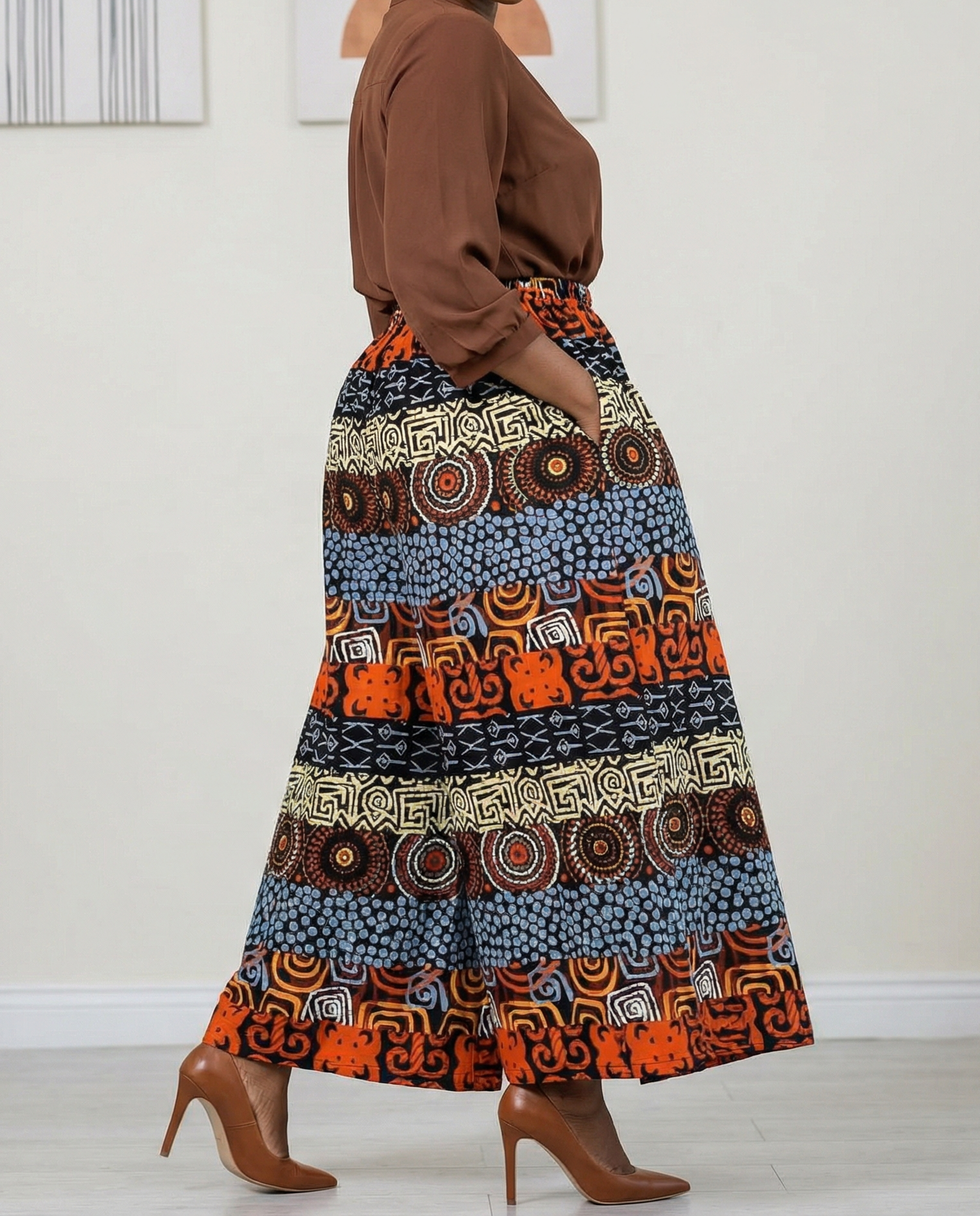 These elegant palazzo pants feature a vibrant African-inspired print with layered patterns and rich colors. Designed with a high elastic waist and a full, flowing silhouette, it offers comfort, movement, and a flattering fit. Perfect for everyday wear, cultural events, or special occasions, this skirt pairs beautifully with fitted tops for a bold, confident look.