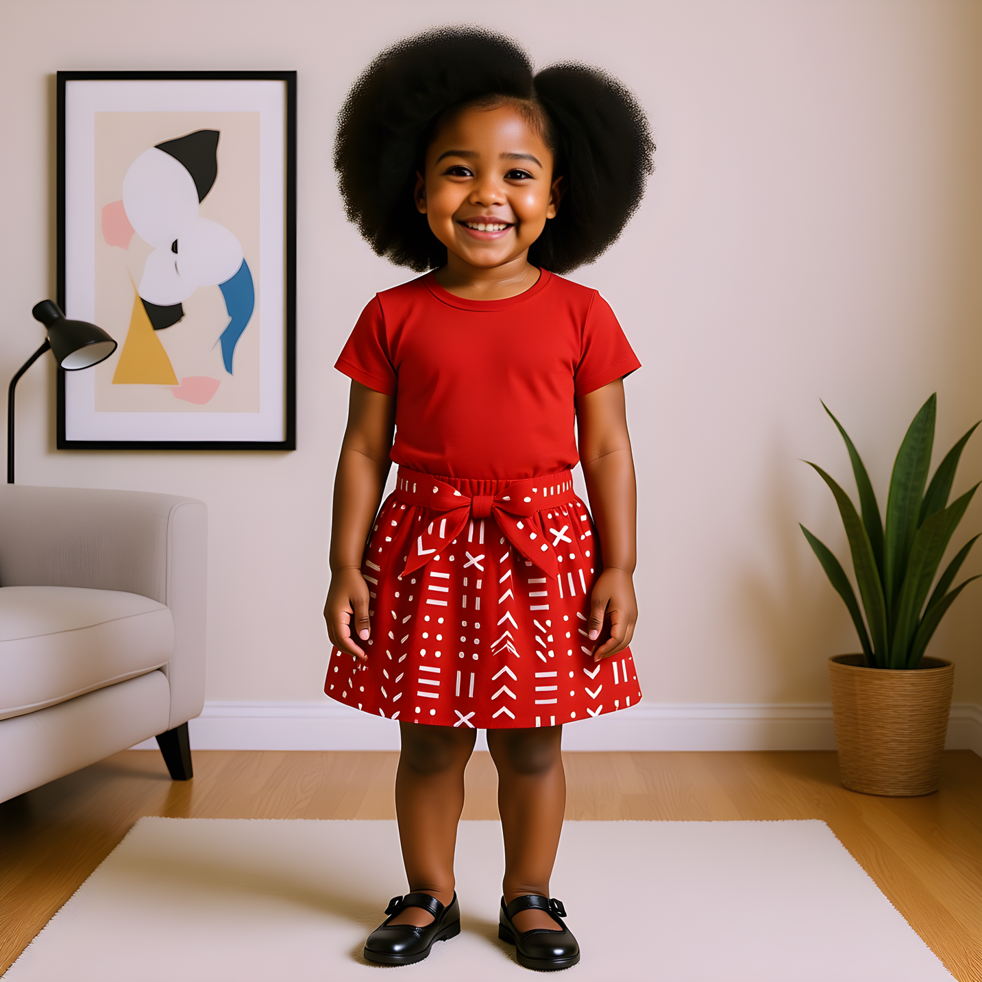 This adorable little girl’s outfit features a bright red African print skirt with white geometric mudcloth-inspired patterns. The skirt is high-waisted with a bow tie at the front, giving it a playful and stylish touch. It falls just above the knees, allowing for comfort and ease of movement. The look is completed with a matching red headband, creating a coordinated and charming ensemble. Perfect for special occasions, cultural events, or everyday wear, this outfit blends tradition with sweet, modern style.