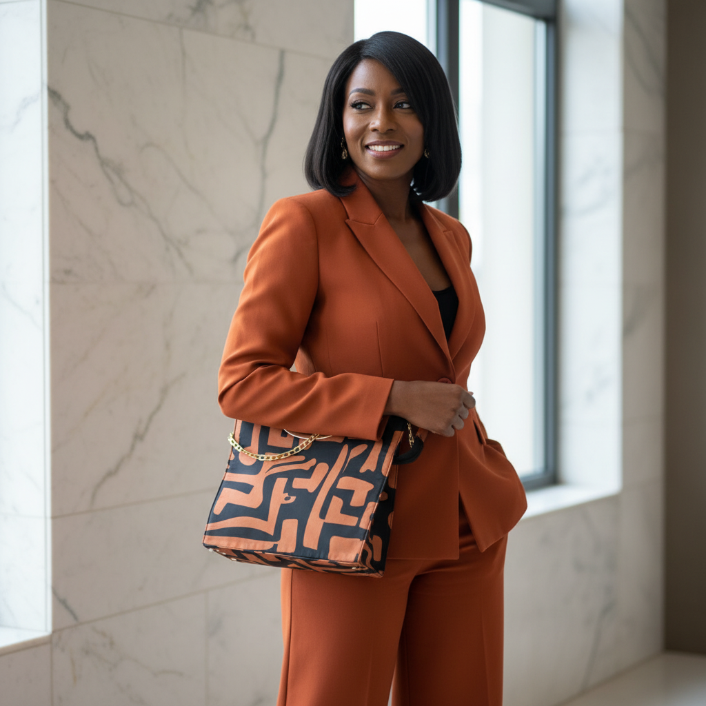 This stylish handbag features a bold red and black abstract pattern on a sturdy fabric exterior, complemented by a polished gold-tone oval handle and a matching detachable chain strap for versatile carrying options. Its modern geometric design and vibrant colors make it a perfect statement accessory for both casual and dressy occasions.
