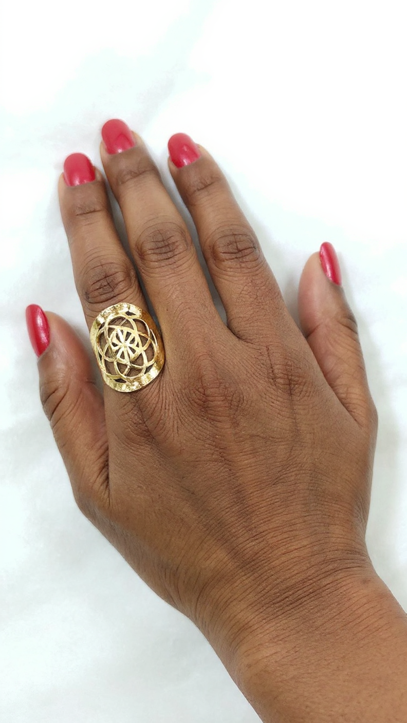 This ring is an elegant and intricately designed gold piece with an openwork or filigree pattern. The design features a central floral or mandala-like motif, made up of interlocking curves and symmetrical shapes, creating a visually captivating effect. The band is wide, with the intricate pattern extending over the top, making it a statement piece that covers a significant part of the finger. The polished gold finish enhances its sophisticated look, and the open spaces within the design give it a light, airy feel despite its bold size. The ring pairs well with red-painted nails, which add a vibrant contrast to the gold.