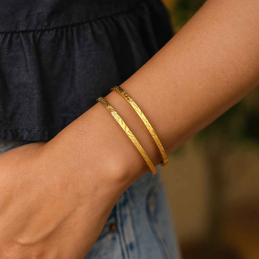 This bracelet features a slim, polished gold-tone design with a delicate embossed pattern of intersecting curves and small dotted accents. Its reflective finish and intricate detailing give it a luxurious and timeless look, making it perfect for both casual and formal wear. Lightweight and elegant, it adds a touch of sophistication to any outfit.