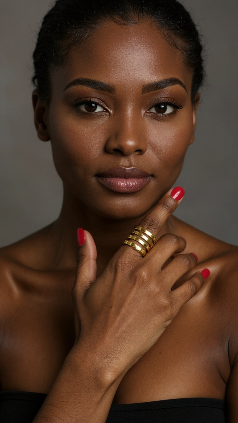The ring in the image is a bold and modern design featuring multiple parallel bands. It has a wide, layered structure with approximately six horizontal, evenly spaced golden bands that wrap around the finger, creating a stacked look. The polished gold finish gives it a sleek, minimalist aesthetic, making it a statement piece that draws attention. This type of ring is versatile and pairs well with various outfits, adding a touch of elegance and sophistication. The person wearing the ring has red-painted nails, which enhance the contrast and highlight the ring's metallic sheen.