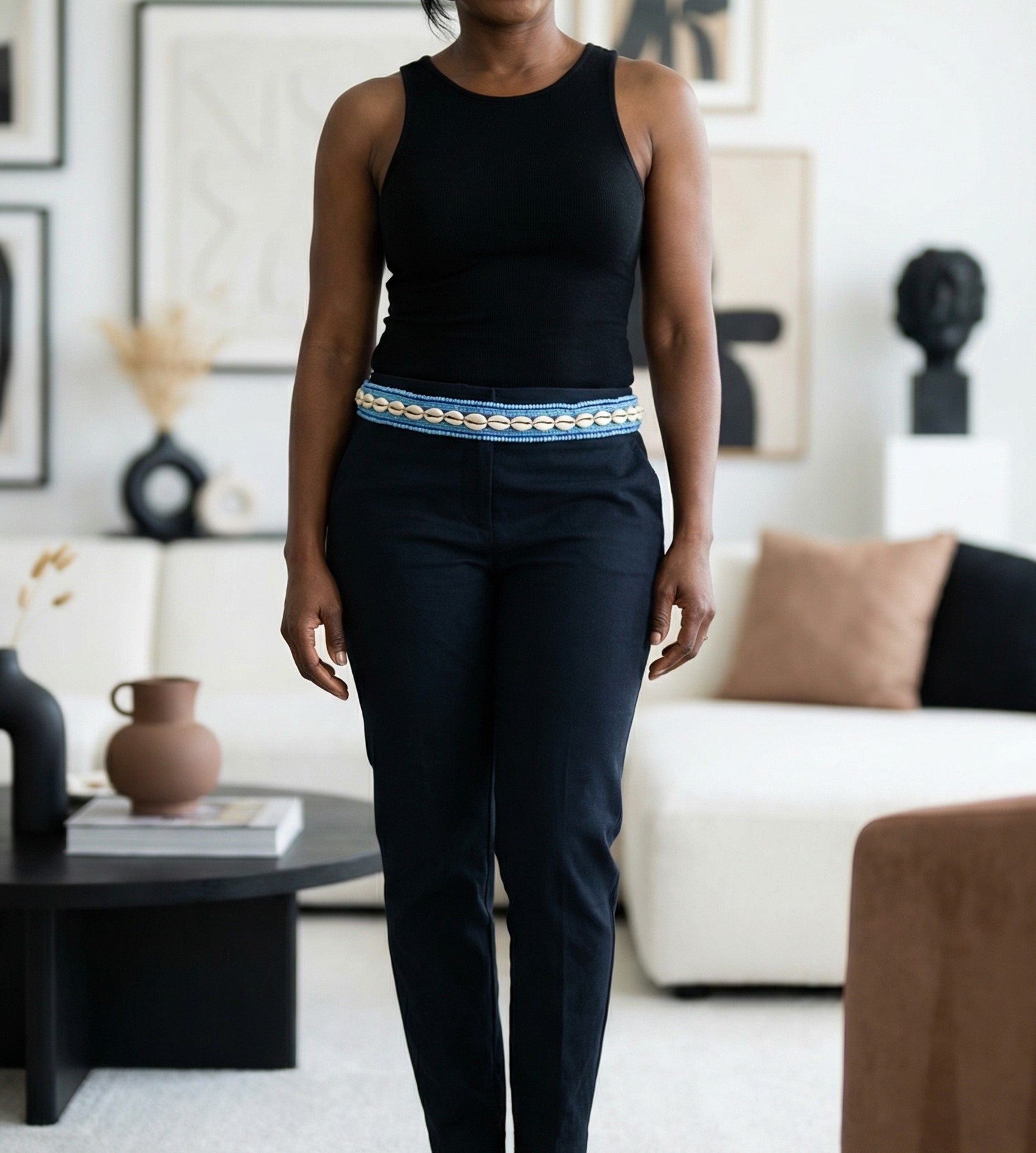 Handcrafted waist belt featuring natural cowrie shells layered over blue beaded strands. Designed to sit comfortably at the waist or hips, this belt adds a bold, cultural accent to outfits. Perfect for festivals, Afrocentric fashion, dance wear, or statement styling.