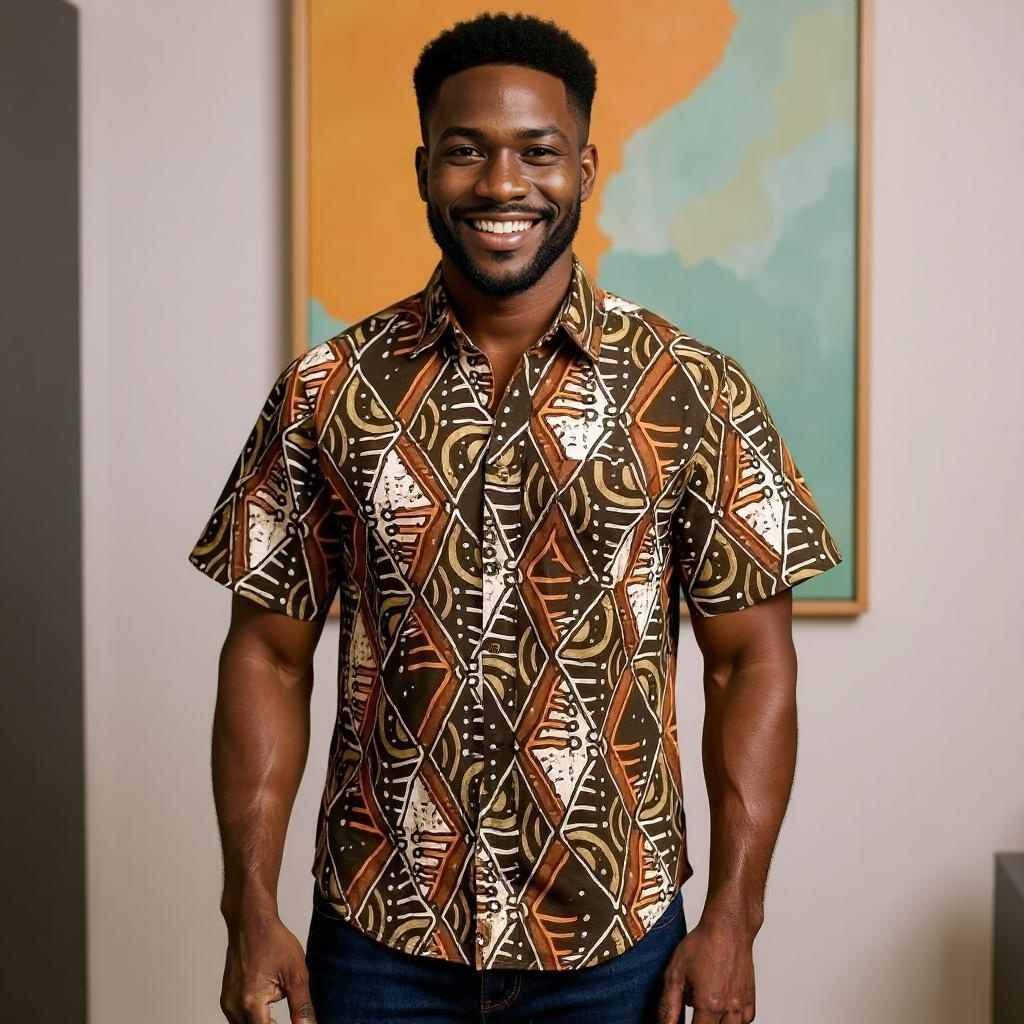 This shirt features a bold, earthy pattern with tribal-inspired diamond shapes and abstract line work in tones of brown, orange, olive green, and white. The diamond shapes are filled with intricate line patterns and dots, giving the shirt a rich, textured appearance reminiscent of traditional African mud cloth designs. The colors create a warm and grounded feel, ideal for someone who appreciates natural, earth-toned attire. Styled as a short-sleeve, collared button-up, this shirt combines classic structure with a cultural and artistic pattern, making it perfect for those who enjoy unique, heritage-inspired fashion pieces.