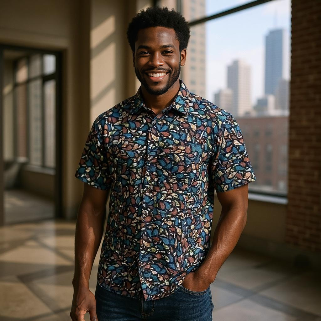 This shirt features a lively and colorful pattern that resembles abstract leaves or teardrops in various shades. The design includes bright colors like blue, red, orange, green, and yellow, which are scattered densely across the fabric, creating a mosaic-like effect. The shirt has a collared, button-up style with short sleeves, adding to its relaxed, casual feel. The overlapping colors and shapes give it a vibrant, almost stained-glass appearance, making it stand out as a bold fashion choice. This shirt has a playful, artistic look, perfect for adding a splash of color to an outfit.