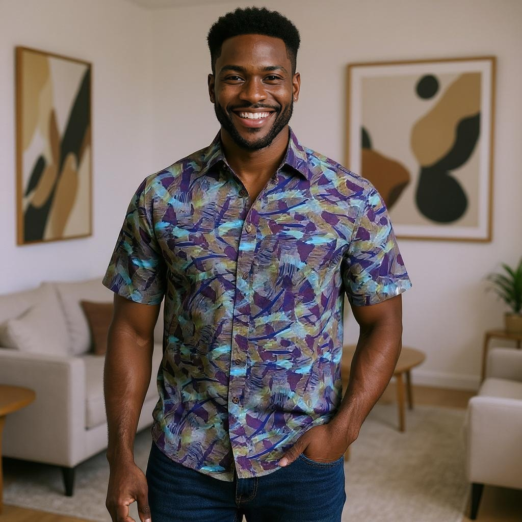 This shirt has an abstract, painterly design with a rich mix of earthy and cool tones. The pattern resembles brushstrokes or leaf-like shapes layered in shades of purple, green, teal, and hints of blue. This color combination gives the shirt a natural, almost forest-like feel, with the interplay of colors creating depth and movement. The collared, short-sleeve button-up style keeps it casual and versatile, while the artistic pattern adds an element of sophistication. This shirt is a great choice for someone who appreciates subtle, art-inspired prints that make a statement without being too bold.