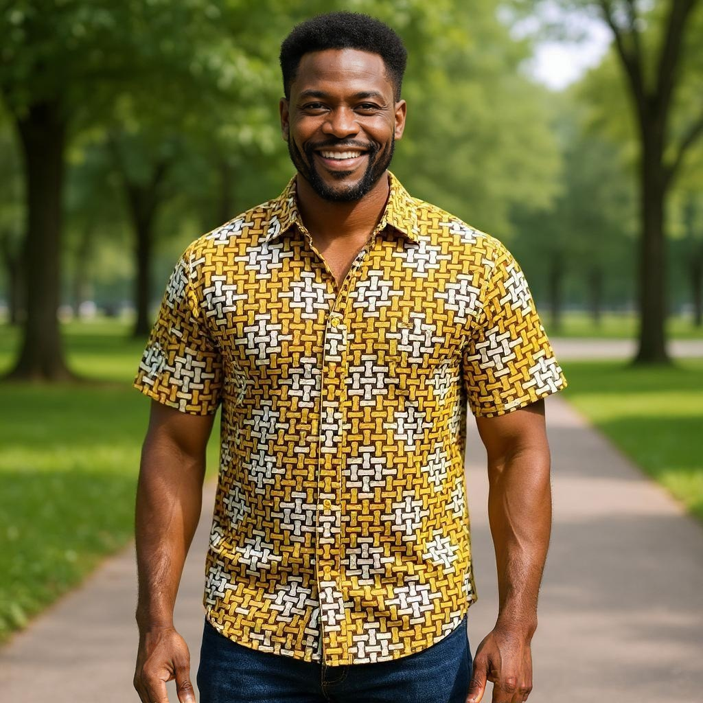 This shirt has a dynamic, interlocking pattern featuring a series of small, curved shapes that resemble puzzle pieces or links. The color palette consists of vibrant yellow, black, and white, creating a striking contrast. The design has a three-dimensional quality, with the shapes arranged to form an almost woven or tessellated look across the fabric. This short-sleeve, collared button-up style gives the shirt a structured but bold appearance. The playful, geometric pattern and bright colors make this shirt a standout piece, perfect for someone with a taste for modern, graphic designs.