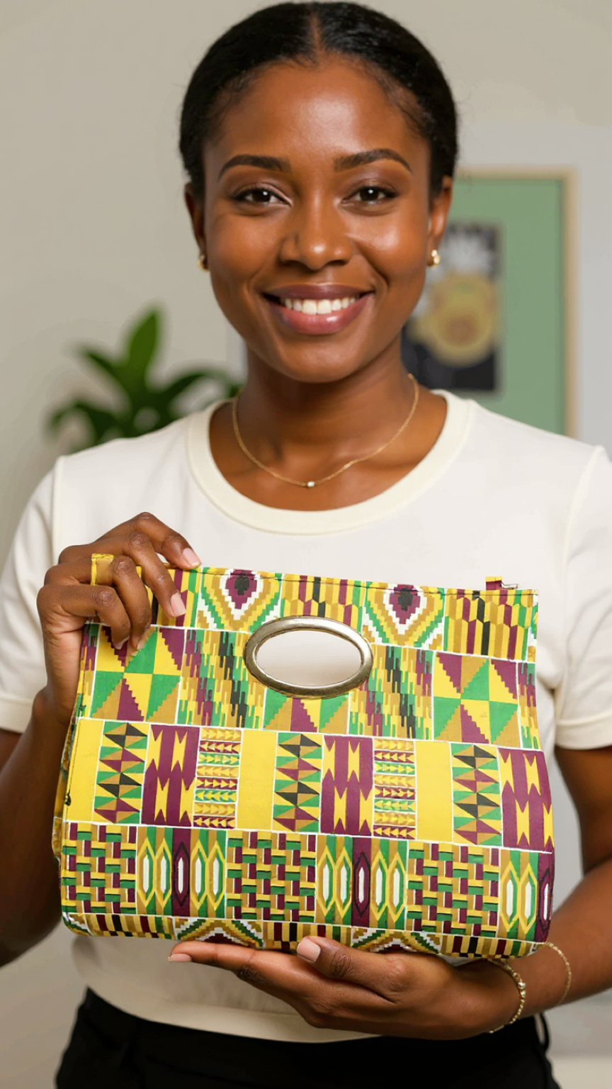 This African print clutch tote bag showcases a vibrant and traditional Kente-inspired design, featuring a bold mix of geometric patterns in rich gold, burgundy, green, and black. The vivid patchwork layout symbolizes cultural heritage and pride. Finished with a sleek gold-tone oval handle, this structured tote is both stylish and meaningful—perfect for cultural celebrations, formal events, or standout everyday fashion.