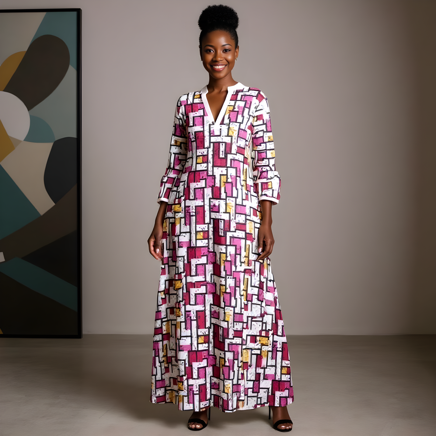 This elegant maxi dress showcases a contemporary twist on traditional African print fashion. It features a structured silhouette with a soft, flowing design, making it both flattering and comfortable. The standout feature is its geometric block print pattern, which seamlessly blends art and culture throughout every inch of the fabric.