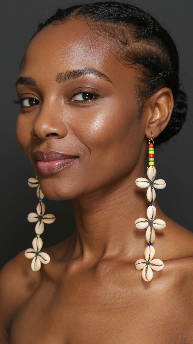 Celebrate culture and style with these handcrafted Cowrie Shell Flower Earrings. Designed with natural cowrie shells arranged into floral patterns, each earring features vibrant red, green, and yellow accent beads that add a bold, Afrocentric touch. Lightweight yet eye-catching, these statement earrings are perfect for festivals, cultural events, or adding a unique flair to everyday outfits.