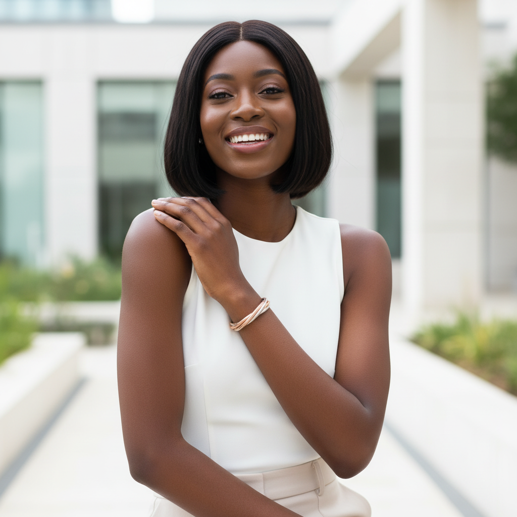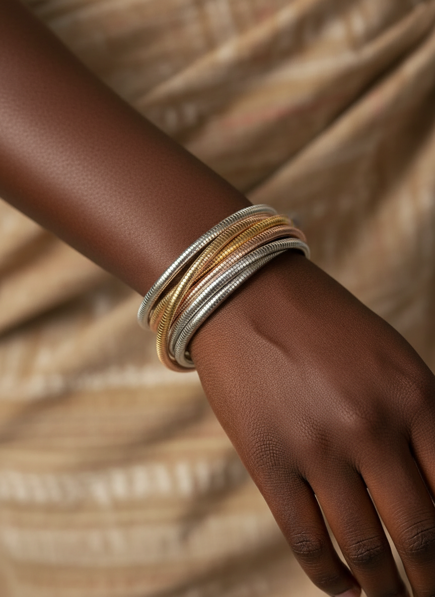 A mixed-metal wrap bracelet made of slim, coiled bands in silver, gold, and copper tones. Flexible, lightweight, and stacked for a layered look. An elegant bracelet features a mix of silver, gold, and rose-gold coils layered together for a modern stacked look. The flexible, smooth metal design wraps comfortably around the wrist, creating a stylish statement that pairs effortlessly with any outfit. Perfect for everyday wear or adding a chic touch to dressy occasions.