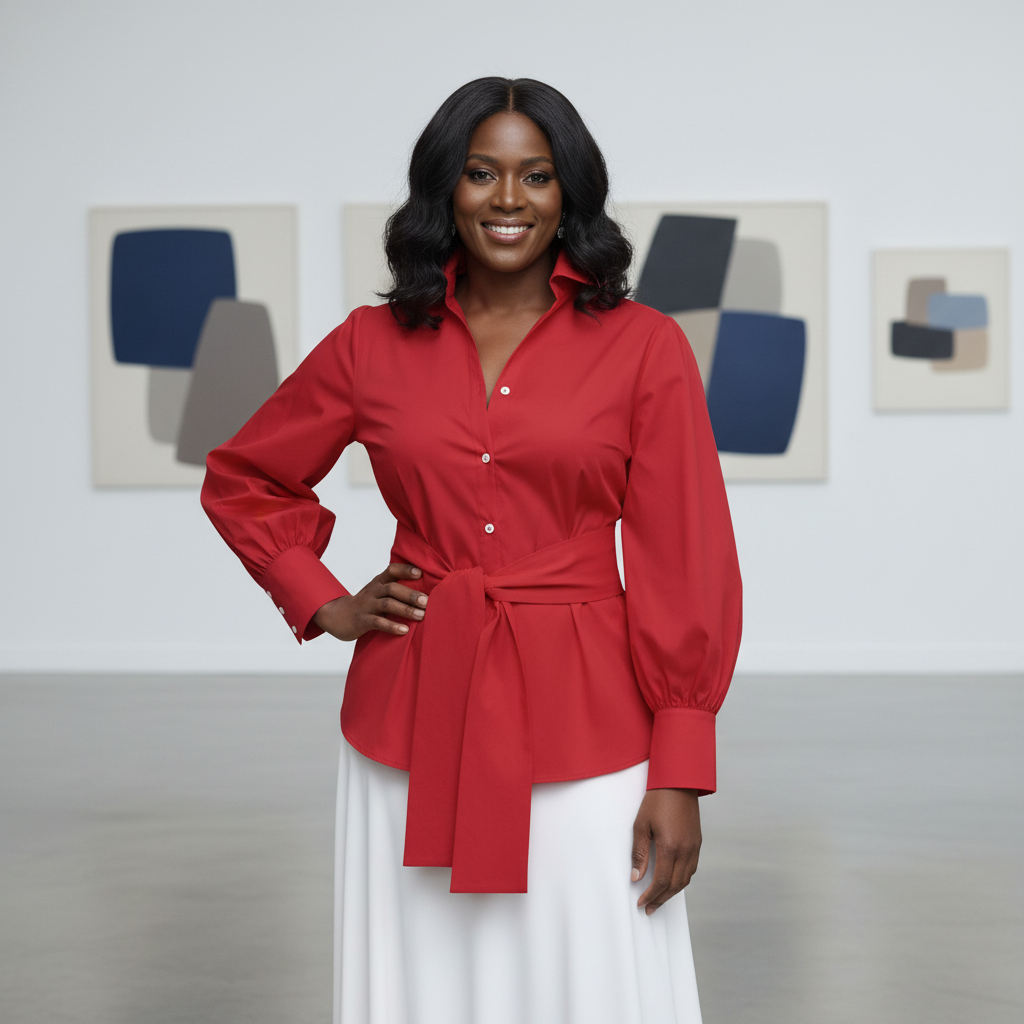 This stylish red blouse features a classic button-down front paired with a flattering tie-waist design that accentuates your shape. The long puff sleeves add a touch of sophistication, while the soft collar creates a polished, feminine look. Dress it up with slacks or a skirt for work, or pair it with jeans for a chic, casual outfit. Perfect for any occasion where you want to look confident and put-together.